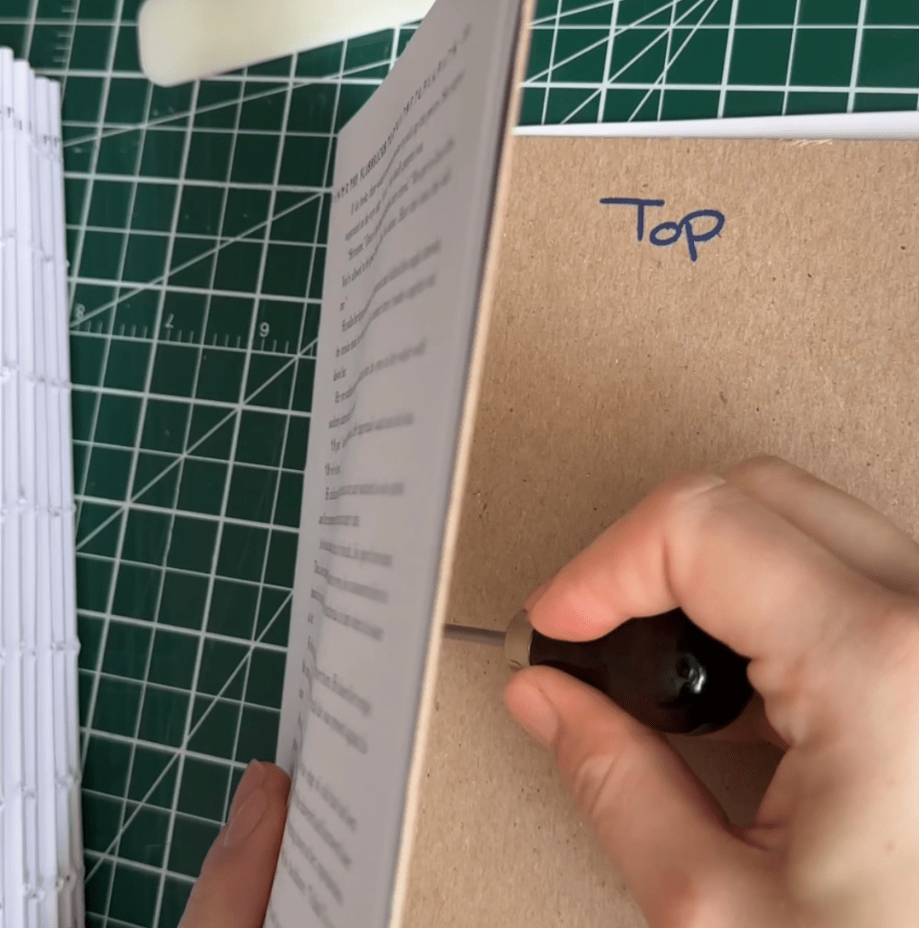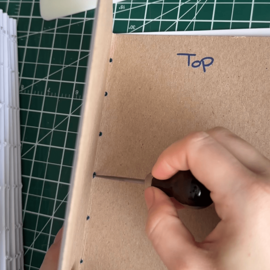 Once all your signatures are folded, it’s time to poke holes in them and sew them all together. I found this easiest to do with a template. I took a scrap piece of construction paper/cardboard that was the same size as my paper and folded it in half.