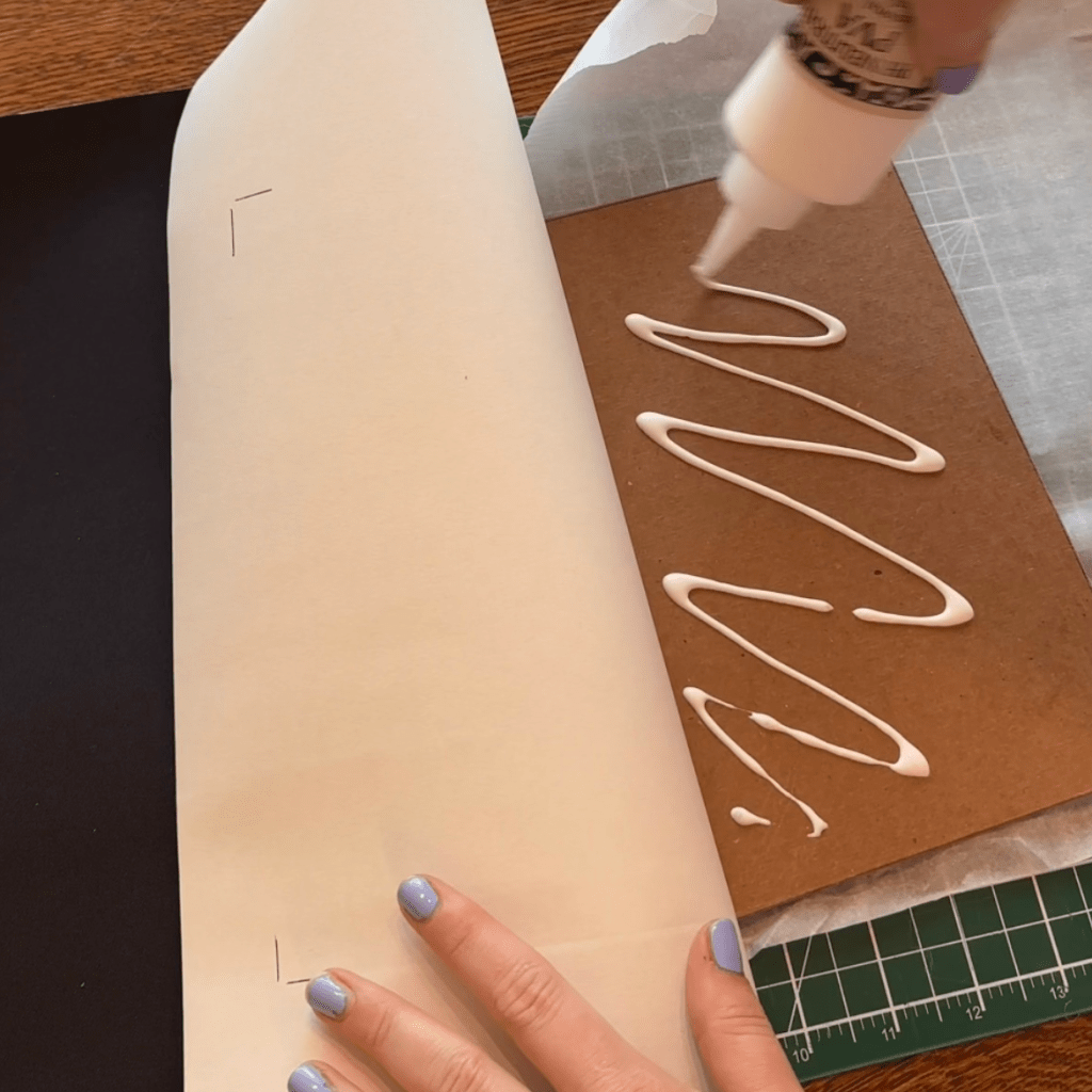 Once you have cut out each book board with your knife on a cutting mat, follow the above instructions to attach your book cloth. I found the parchment super helpful to keep my space clean of glue. I also used the same black card stock from my endpapers as my hinge for the case (that attaches the front cover, back cover and spine.)