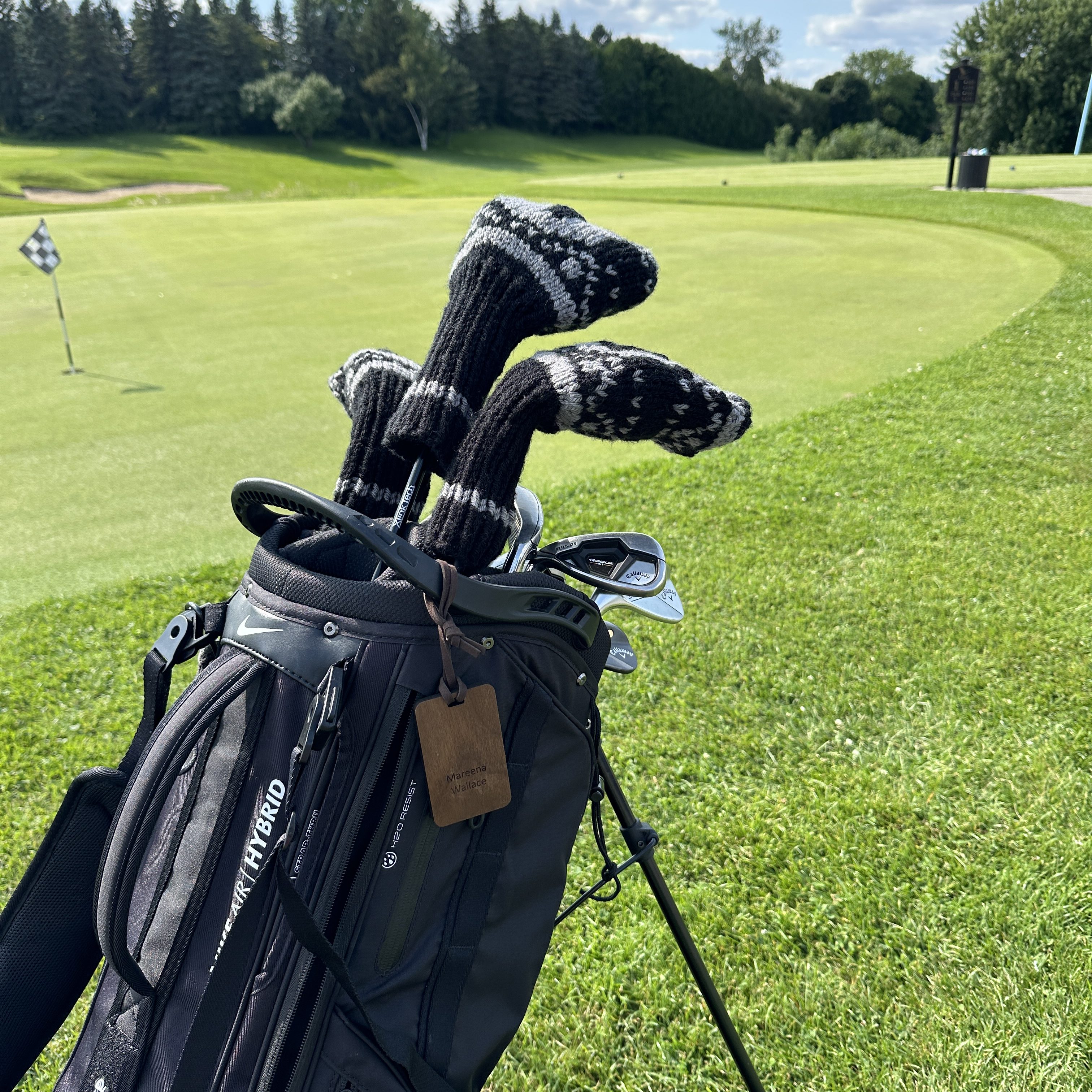 The number on each cover is added using duplicate stitch once the knitting is complete, which means you can change it out any time without frogging the whole thing. A practical detail that golfers will appreciate.